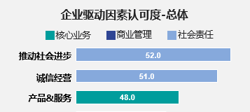 同样值得关注的是,虽然“推动社会经济进步”貌似驱动影响力力排在靠后位置,但它对于驱动企业声誉的作用也不可小觑。企业想要赚钱无可非议,但真正伟大的公司一定会着眼于助力人类和社会进步的事情,企业的利益才能最大化。全球互联网巨头谷歌就在身体力行, 而很多中国互联网企业也正在通过自己的方式致力于看似无收益,但对人类社会进步有推动作用的事情。从长远来看,这能潜移默化促进企业声誉的塑造,能赢得消费者的信赖和好感,也是中国互联网企业最大的优势。